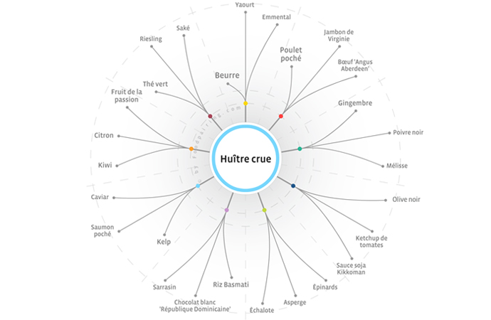 Le produit principal sélectionné se situe au centre et les ingrédients auxquels ce produit peut être combiné sont situés tout autour. Plus un ingrédient est proche du centre, plus la combinaison est bonne.